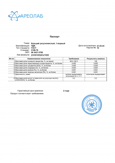 Синонимы: Кальций уксуснокислый, 1-водный, Кальций ацетат моногидрат.