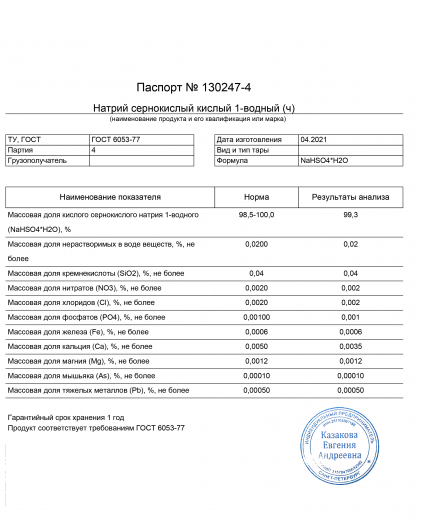 Синонимы: Натрий сернокислый кислый 1-водный; Бисульфат натрия