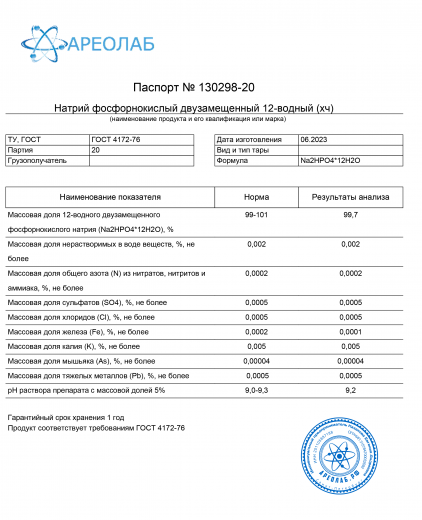 Формула: Na2HPO4*12H2O CAS # 10039-32-4 Синонимы: Натрий фосфорнокислый двузамещенный 12 водный; Гидроортофосфат натрия; Динатрийфосфат; Гидрофосфат натрия 12-водный; Гидроортофосфат натрия 12-водный ГОСТ 4172-76 Пр-во: Россия Срок хранения: 1 год Квалификация: ХЧ Содержание основного вещества: 99,5% Бесцветные кристаллы, хорошо растворимые в воде Цена указана для фасовки 0,5 кг. Натрий фосфорнокислый 2-замещенный 12-водный — кристаллогидрат с двенадцатью молекулами воды кислой натриевой соли ортофосфорной кислоты. Представляет собой бесцветное кристаллическое вещество, без запаха. Легко растворяется в воде, слабо растворим в этиловом спирте. Теряет воду при нагревании и превращается в гидрофосфат натрия. Взаимодействует с фосфорной кислотой, со щелочами, с солями сильных кислот. Додекагидрат гидрофосфата динатрия представляет собой гидрат, который представляет собой додекагидратную форму гидрофосфата динатрия. Он содержит гидрофосфат динатрия.