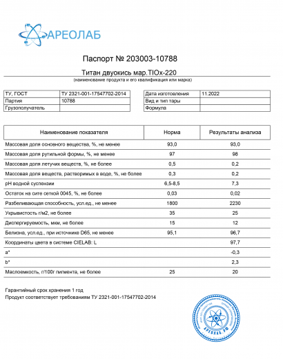 Диоксид титана купить. ТУ 2321-001-17547702-2014 Пр-во: Россия Срок хранения: 1 год Марка TIOx-220 . Степень чистоты (ЧДА).