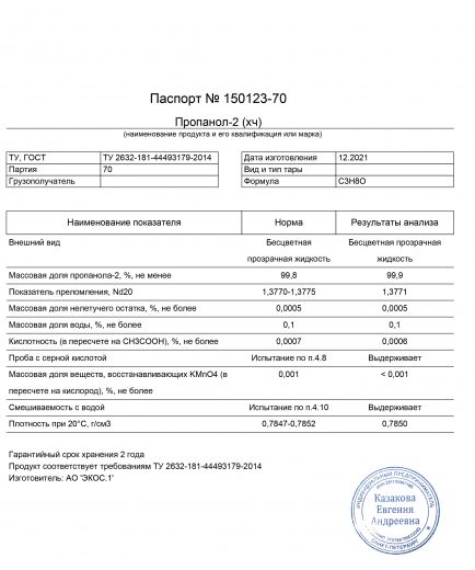 Химическая формула: CH3CH(OH)CH3 Рег. номер CAS: 67-63-0