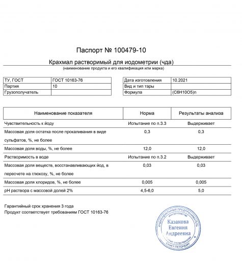 Крахмал растворимый - однородный белый порошок, с запахом свойственным крахмалу. Применяется крахмал в окислительно-восстановительных реакциях в качестве индикатора, а также в химической, бумажной и других отраслях народного хозяйства.