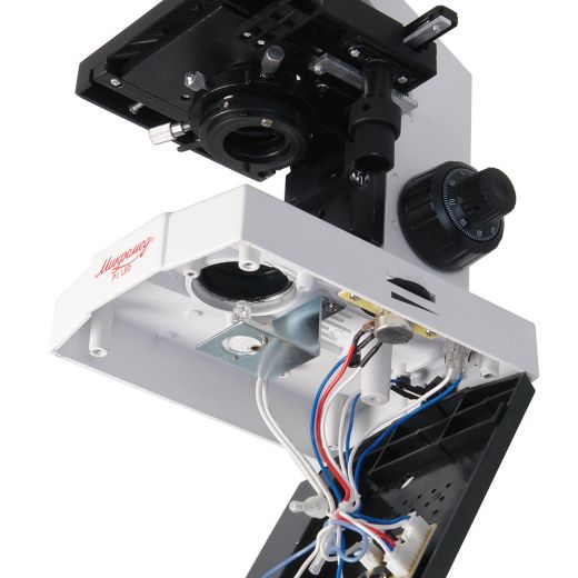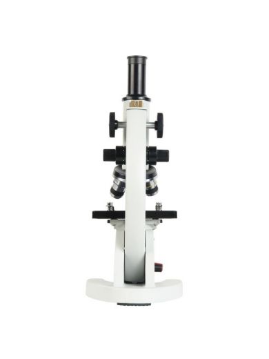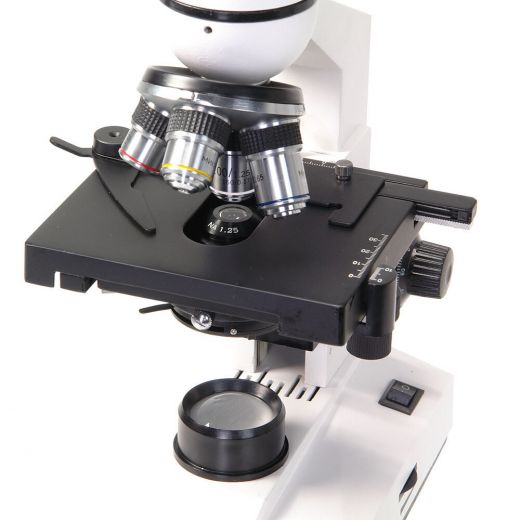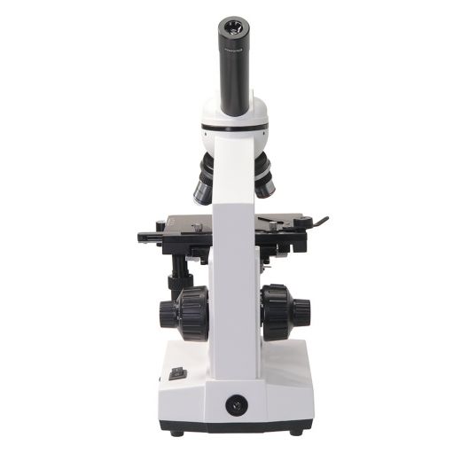 Коаксиальный механизм грубой и точной фокусировки по своему принципу похож на тот, который применяется в микроскопах гораздо более высокого класса. Так же, коаксиальные рукоятки присутствуют и на предметном столике.
