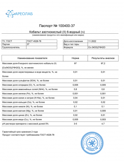 ГОСТ 4528-78 Пр-во: Россия Внешний вид: Буро-красные кристаллы Химическая формула: Co (NO3)2*6H2O Срок хранения: 2 года Содержание основного вещества: 98,4% Квалификация: «Ч». Синонимы: кобальт азотнокислый, кобальт азотнокислый (II) 6-водный. Кобальт азотнокислый купить вы можете на этой странице.