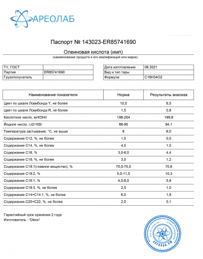 Олеиновая кислота - маслянистая жидкость, легче воды, без запаха, нерастворима в воде, но растворяется в органических растворителях. Применяется для получения лакокрасочных материалов, как пластификаторы; в мыловарении; при обработке металлов резанием — хонингованием, протягиванием, развертыванием и пр.; также используется в качестве стабилизатора магнитных жидкостей; в производстве замасливающих средств; входит в состав косметических средств; входит в состав олеина.